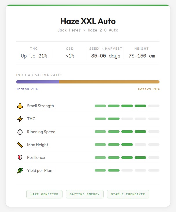The cannabis genetics combine Jack Herer with Haze 2.0 Auto, landing at roughly 70 percent sativa and 30 percent indica. That means a tall, open plant with wide internodal spacing, elongated resinous buds, and a cerebral high that lasts for hours. THC reaches up to 21 percent — solid high THC seeds territory for the autoflower class. If you have been searching for the best cannabis seeds to experience real Haze without the 14-week photoperiod wait, growing cannabis with these marijuana seeds is a revelation. The cannabis genetics were stabilized through repeated backcrossing, and it shows in every uniform plant that comes out of the pack.